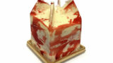 全面が薄い板状のホワイトチョコレートでコーティングされていて、上部は寄せて閉じてあります。底もチョコで覆われていてサイドにも継ぎ目が見えなかったので、ある程度柔らかいホワイトチョコの箱を作って、中にケーキを詰めて上部を閉じてあるんですかね?
